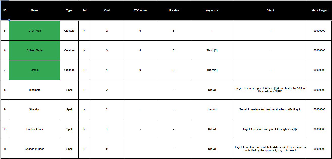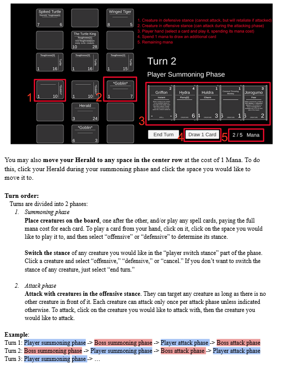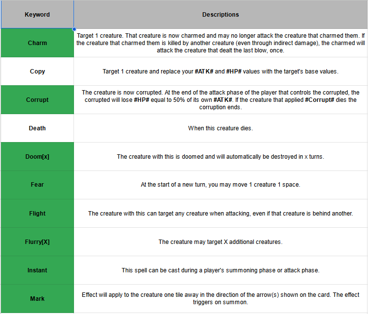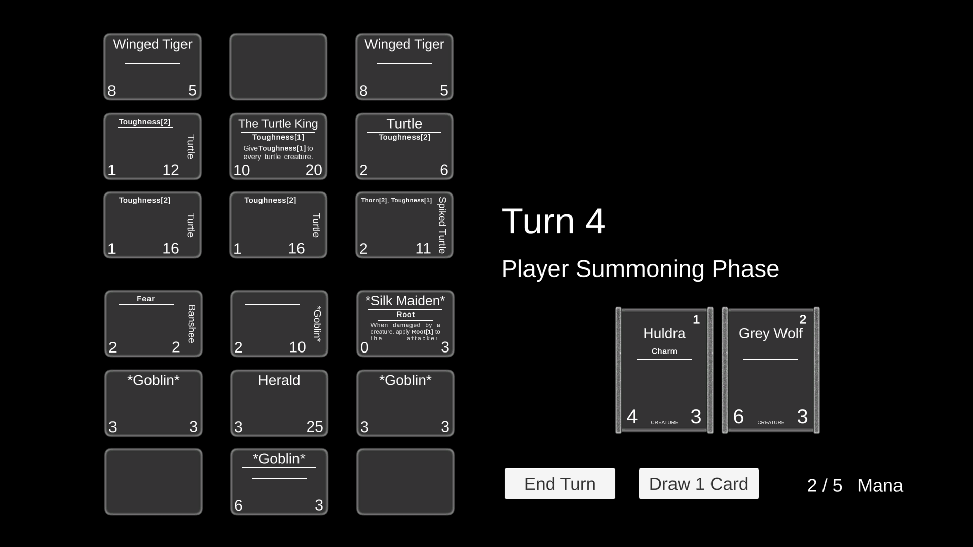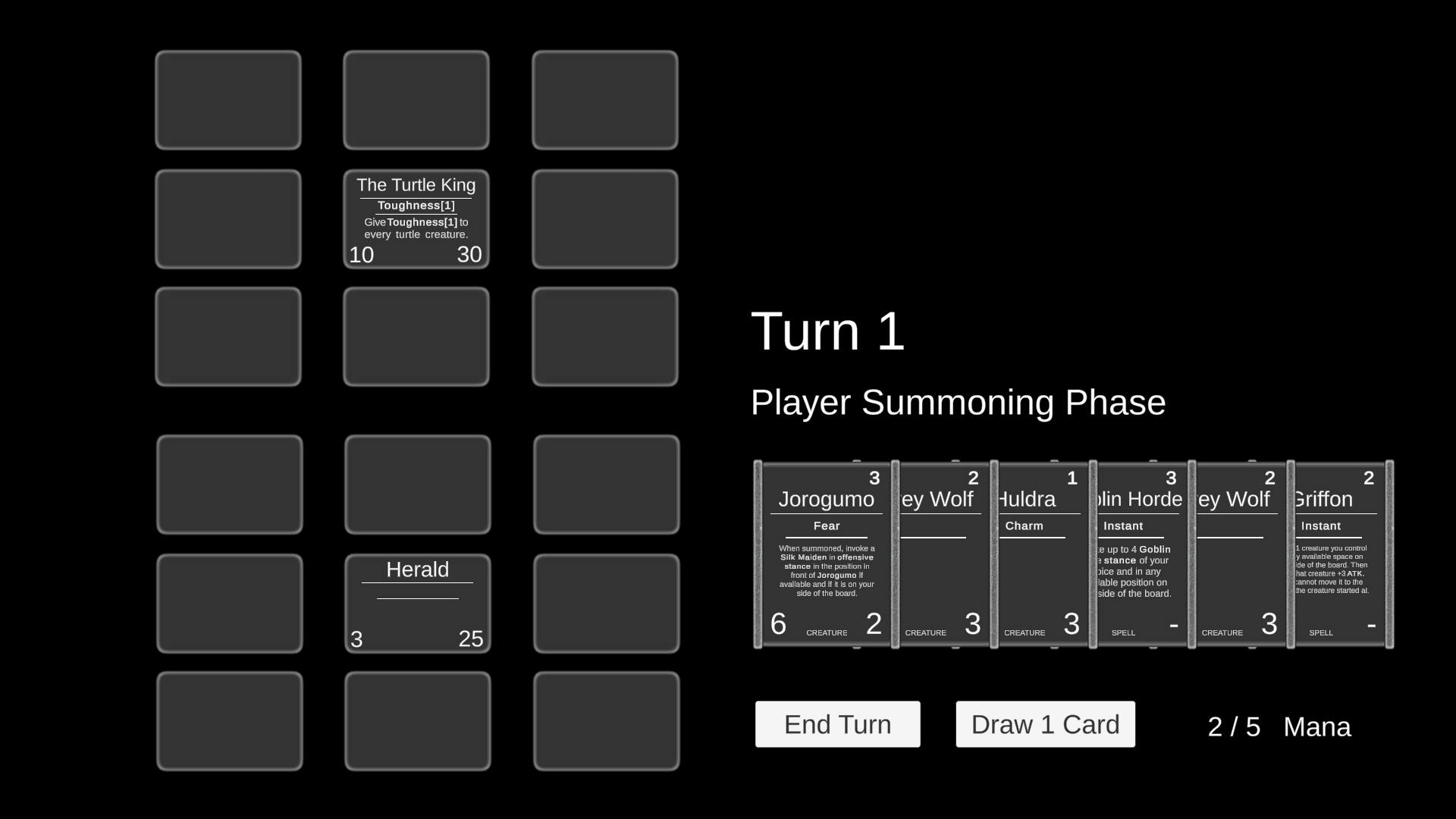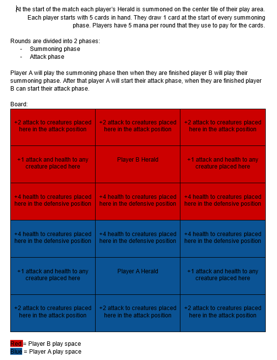 There are 2 main types of cards, spells and creatures. Creatures are summoned on the board (example of the board below) in either offensive or defensive stance. This will result in a modification in their base stats and will determine how they are able to interact with the opponent’s creatures. Spell cards are cards that are played and their effects are instantly resolved, they are then discarded.