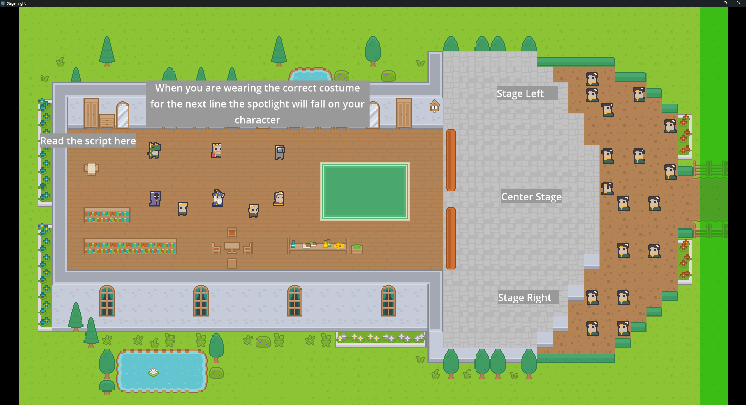 For this project I was the team’s main game and level designer. The interesting challenges that I encountered were tweaking some small rules to adjust the difficulty. For example, having to determine what happens once the script is opened. It would be too easy if you could just have the script open on the screen all the time, so we made it so it covered most of the backstage making it harder to navigate. The person reading the script cannot move from that spot while reading it, and finally, actors are not able to recite a line while the script is open. I thought that these constraints were enough to make the game challenging, while still making it accessible. From our internal playtesting we felt like we reached an enjoyable spot that balanced difficulty and fairness quite well.